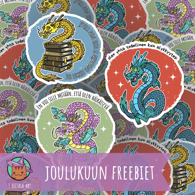 Jokaisen verkkokauppa tilauksen mukaan tulee freebie tarra. Joulukuussa poikkeuksellisesti jakoon lähtee 3 freebie tarraa. Teemana lohikäärmeet hauskoilla teksteillä. Tarra vaihtuu kuukausittain.