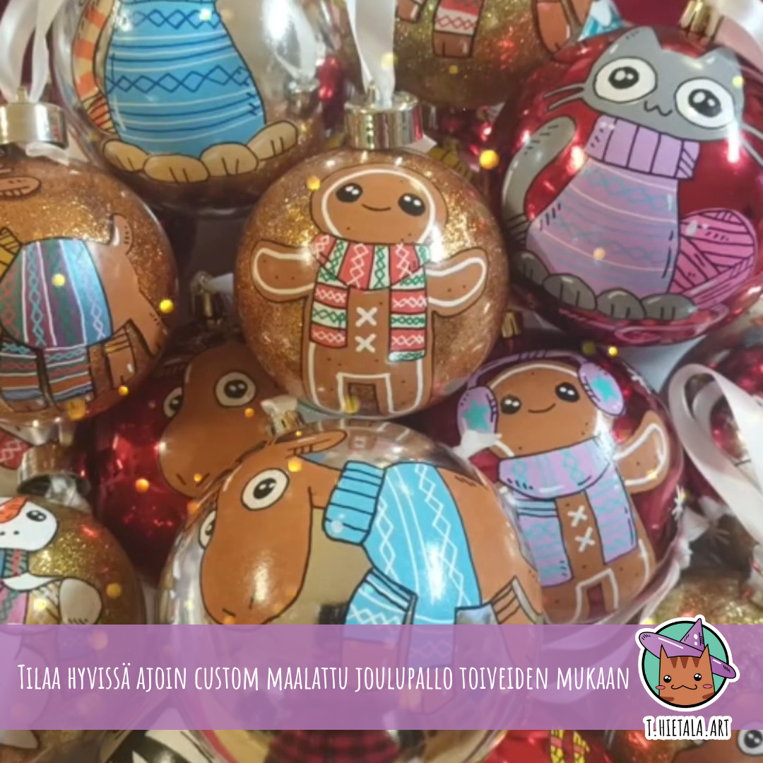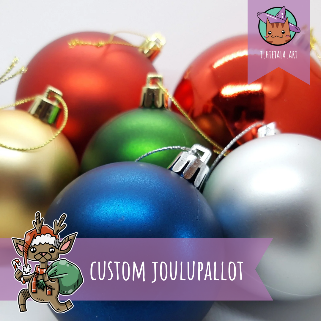 Haluat uniikin mittatilauksena tehdyn joulupallon? Valitse väri ja ostoskorissa olevaan viestikenttään voi kirjoittaa millaisen joulupallon haluaa. Kuvissa näkyy muutamia malleja millaisia joulupalloja voi esim tehdä.